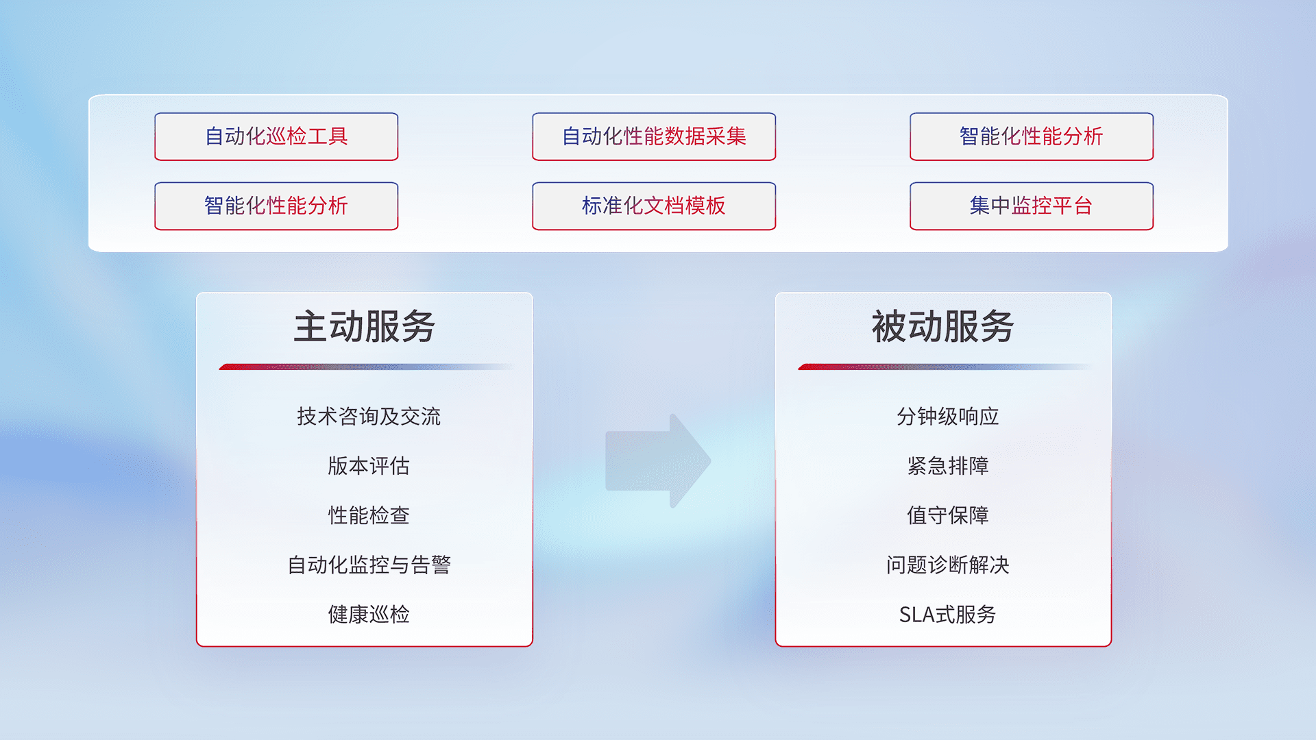 智能化工具和标准化文档,,,保障服务质量,,,,提供主动服务(包含技术咨询、、、、版本评估、、、性能检查、、自动化监控与告警、、、健康巡检)和被动服务包含(分钟级响应、、、、紧急排障、、、值守保障、、、问题诊断解决、、、、SLA服务)。。